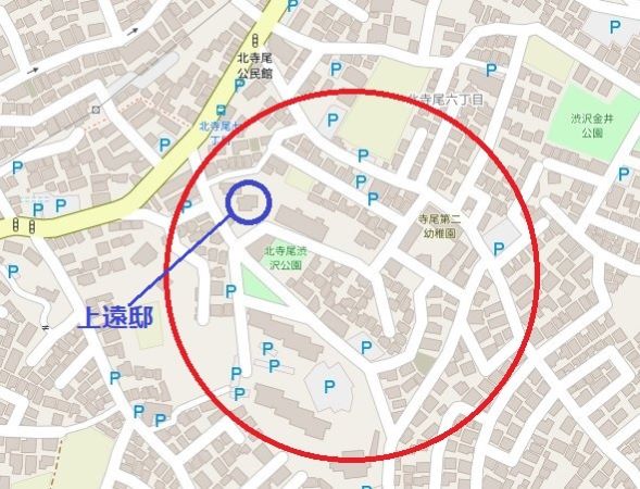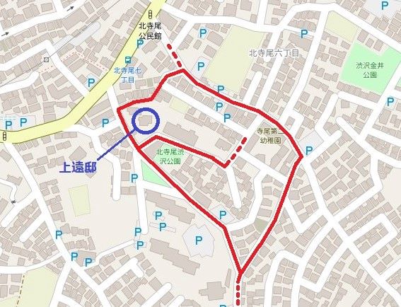 左手に上遠邸があり、右手の駐車場のさらに右隣りが北寺尾渋沢公園だ