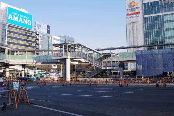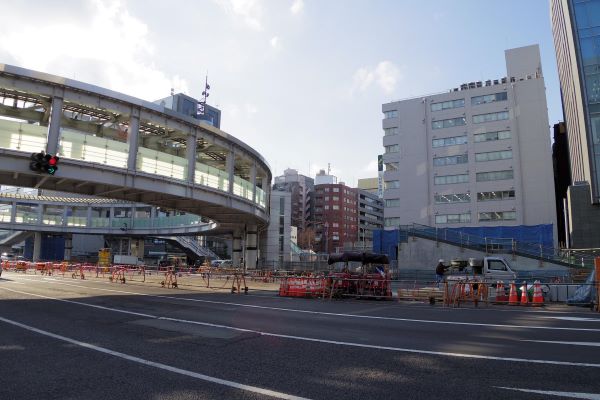 画像左の車道奥が3番出入口付近。青い囲いと復旧作業中の階段が見える