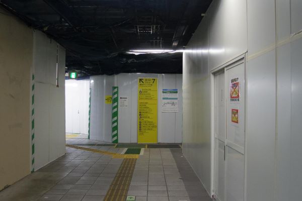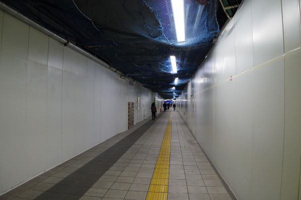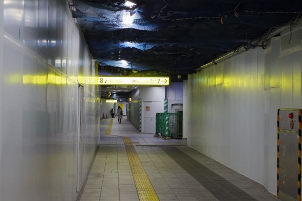 7番出入口方面の通路。画像手前の仮囲い内部では新たな改札を工事中