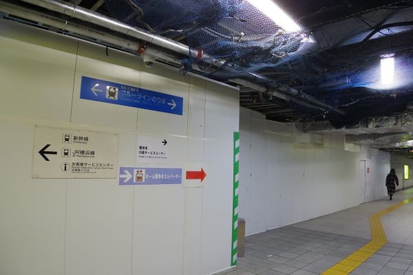 ブルーライン新横浜駅の構内で工事を行っている部分は、主に改札外の通路。JR線連絡改札と日産スタジアム改札の間の通路を相鉄・東急直通線の改札口に直結させるため、その工事が行われている。