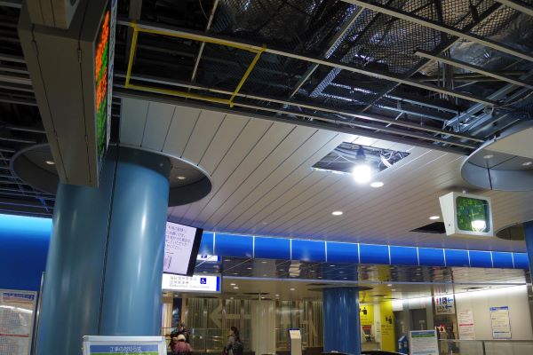 JR線連絡改札側から順次天井のパネルを張り替えている