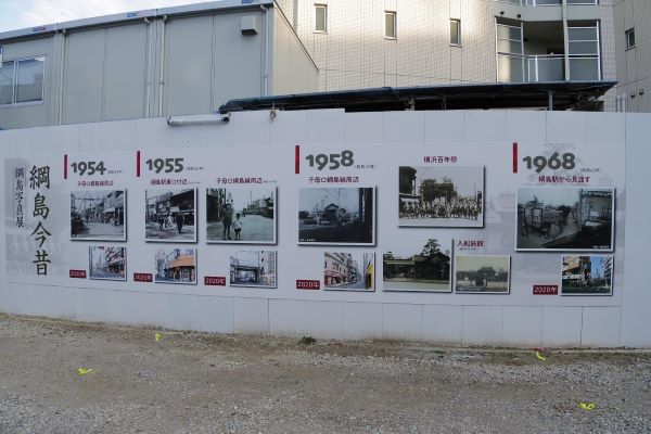 仮囲いには高層マンション「ドレッセタワー新綱島」の宣伝や、今昔の様子が分かる写真も掲示されていた。合わせて横浜市側で綱島街道の拡幅や電線類の地中化工事、下水道工事も進められている。