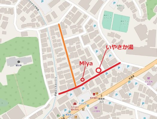 記憶を頼りに作成したものなので、若干位置は正確さを欠く。もしかしたら「いやさか湯」はもう少し東寄りだったかもしれない。