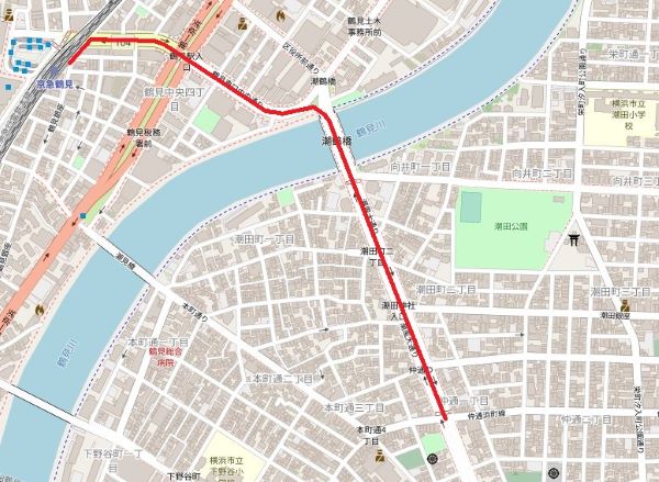 下のマップの赤いラインが、京急鶴見駅から仲通り一丁目交差点までのルート。距離にして1.2km弱。徒歩15~20分程度というところだ。