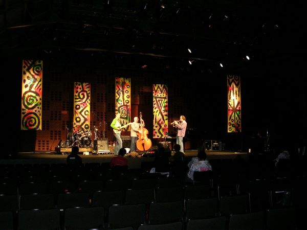 「横濱ジャズプロムナード」でステージの背景を飾るロコさんの作品(photo© Rocco)