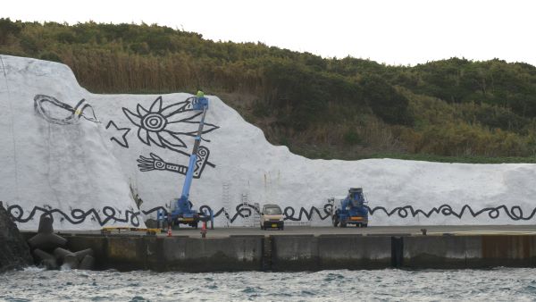 鹿児島県のアートプロジェクトとして依頼されたこの壁画は今、島の玄関口である前籠(まえごもり)港の岸壁で、両手を広げて来島者を出迎えるかのように存在している。