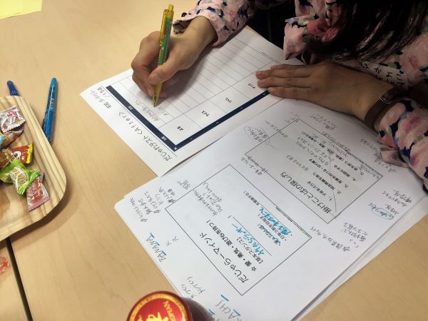 真剣にだじゃれに取り組む参加者たち(★)