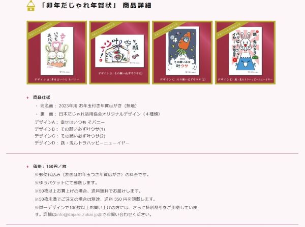 今年(2023年)版の年賀状はすでに販売を終了しているが、毎年制作している年賀状では、協会でだじゃれフレーズを考え、デザインを一般公募しているという。