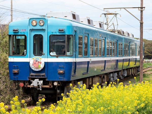 菜の花咲き乱れる中を走る銚子電鉄(★)